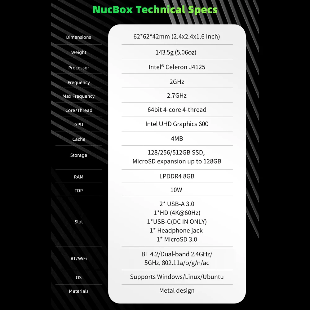 | 8GB+512GB Memory Mini PC Intel Celeron J4125 Processor Intel UHD Graphics 600 GPU Dual-band WiFi EU/US Plug |