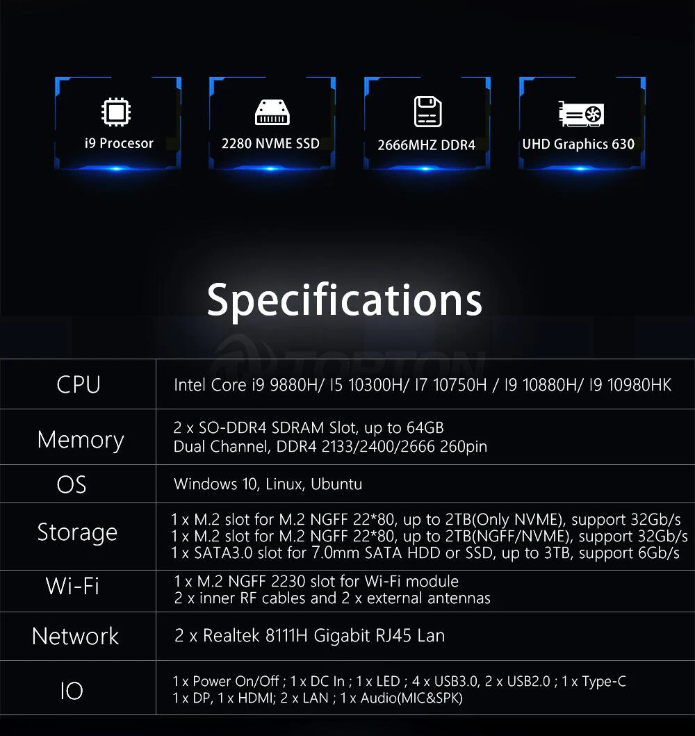 Buy Now On Aliexpress2021 TOPTON Newest Mini PC Intel i9 10980HK 8 Cores 16 Threads 2 Lans Win10 2*DDR4 2*NVME Gaming Desktop Computer 4K DP HDMI2.0
