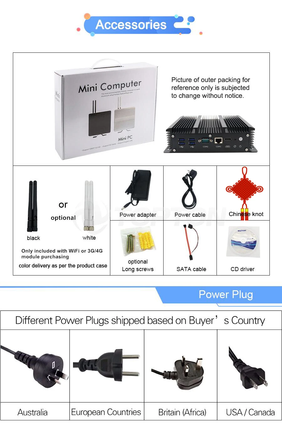 2. 7th Gen Kaby Lake 14nm Intel Celeron 3865U 2 cores 2 threads 1.8GHz 2MB cache TDP 15W Intel HD Graphics 610.(SUPPORT AES-NI, Dimension 209*150*57mm) 3. 7th Gen Kaby Lake 14nm Intel Core i3 7167U 2 cores 4 threads 2.8GHz 3MB cache TDP 28W Intel Iris Plus Graphics 650. (SUPPORT AES-NI, Dimension 209*150*57mm) 4. 7th Gen Kaby Lake 14nm Intel Core i5 7267U 2 cores 4 threads 3.1GHz up to 3.5GHz 4MB cache TDP 28W Intel Iris Graphics 650.(SUPPORT AES-NI, Dimension 209*150*57mm) 5. 4th Gen Haswell 22nm Intel Core i3 4005U 2 cores 4 threads 1.7GHz 3M cache TDP 15W Intel HD Graphics 4400. (SUPPORT AES-NI, Dimension 170*150*45mm) 6. 4th Gen Haswell 22nm Intel Core i5 4200U 2 cores 4 threads 1.6GHz up to 2.6GHz 3M cache TDP 15W Intel HD Graphics 4400. (SUPPORT AES-NI, Dimension 170*150*45mm) 7. 6th Gen Skylake 14nm Intel Core i3 6157U 2 cores 4 threads 2.4GHz 3M cache TDP 28W Intel Iris Graphics 650. (SUPPORT AES-NI, Dimension 170*150*45mm) All bundles on sale DO NOT include WiFi(antennas), 3G/4G module, WiFi(antennas) cost US $7, 3G module cost US $50, 4G module cost US $70. If you need, pay at this link. - Fanless system without cooling fan, no any noise, thicker and longer heat-sink fins for working as long as 7x24 hours durably. - 6*Intel i201/i211 Gigabit RJ45 LANs and 2*RS232 COM ports, support Windows, Linux and pfSense OS. - 1*mSATA SSD+1*2.5'' SSD/HDD installation supported. - One embedded SIM card slot onboard, 3G/4G/WiFi optional. - Applied in Firewall, Network Server, Network Security, VPN Router etc. - Full Aluminum Alloy Black color shell, Exquisite production craft on outside design with high quality, slim design 209*150*57MM. - Low consumption save much energy and eco-friendly. - Support Watchdog, AWAL, RTC, WOL, PXE, Reset functions. Dimension 209*150*57mm Case: Dimension 170*150*45mm Case: Free Operating System: Default installed Pfsene. Other systems we can install free are like Windows, Linux, Ubuntu etc if you need. Seller is irresponsible and makes no compensation for trial system. You also can install OS and software package by yourself. F11 key boot from USB Drive. ESC key enter into BIOS. 1. WiFi(antennas) add extra 7$, 3G module add extra 50$, 4G module add extra extra 70$. 2. 500GB 2.5'' HDD add extra 50$, 1TB 2.5'' HDD add extra 75$, 2TB 2.5'' HDD add extra 100$. Upgrading link: https://fr.aliexpress.com/item/1005001645834971.html (how many dollars to upgrade, pay how many pieces, US$1=1pcs, For example upgrade USB IR remote, pay 14pcs for US$14, remember to leave message noting which one you upgrade for...)
