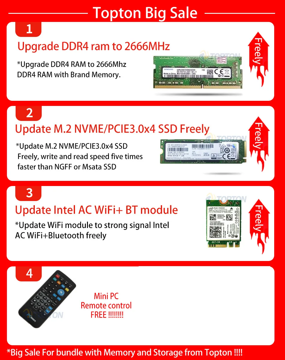2. Upgrade strong signal AC WiFi+Bluetooth free! 3. Upgrade M.2 SATA SSD to fast M.2 NVME/PCIE3.0x4 SSD free! Product Highlight - Onboard Intel Coffee Lake 10th/9th/8th generation powerful processor for online games. - 2xSODIMM DDR4 memory slot up to 64GB more powerful performance improve work efficiency and give you a smooth experience. - Support HDMI, DP and Type-C for triple 4K display output synchronously and asynchronously - Support 2*M.2 2280 NVME/PCIE3.0x4 SSD+1*2.5'' SATA HDD/SSD. - Support 2*Gigabit RJ45 Lans+M.2 2230 2.4G/5G Dual band AC(AX) WiFi/Bluetooth - Brushed Aluminum Alloy Black color shell, Exquisite production craft on outside design. Processor parameter for referance only What's in the package 1xMini PC 1xPower supply 1xPower cable ( we ship correct power plug base on buyer's address ) 1xUser Manual 2xWiFi Antenna Accessories as Ram, SSD, HDD, we use famous brand:samsung, micron, SanDisk, toshiba, hynix, crucial, liteon, kingfast, phison etc, What brand we use depends on our test and our stock. 1. USB Infrared remote (can turn power off but not on) add extra cost US$14. 2. External USB DVD-ROM add extra cost $18. 3. USB 2.4GHz Air Keyboard& Mouse, add extra cost $20. 4. Genuine OEM license sticker cost 35$. 5. 500GB 2.5'' HDD add extra 50$, 1TB 2.5'' HDD add extra 65$, 2TB 2.5'' HDD add extra 100$. 6. Intel AX200 WiFi6 Bluetooth5.1 card add extra 20$. Uprading link: https://www.aliexpress.com/item/1005001805737528.html (how many dollars to upgrade, pay how many pieces, US$1=1pcs, For example upgrade USB IR remote, pay 14pcs for US$14, remember to leave message noting which one you uprade for...)