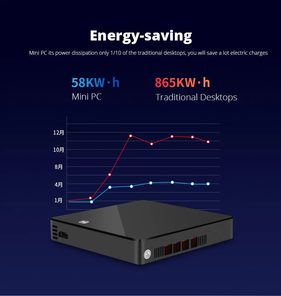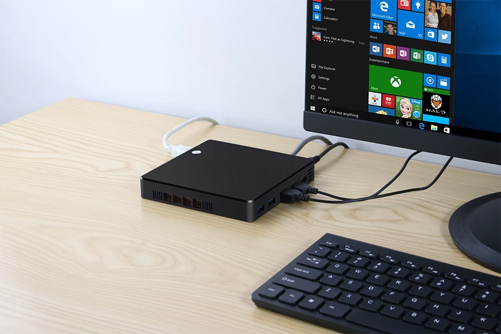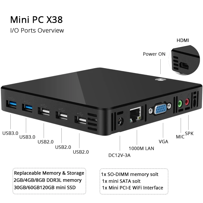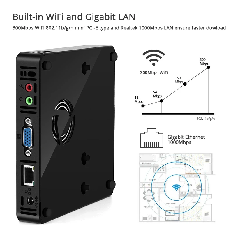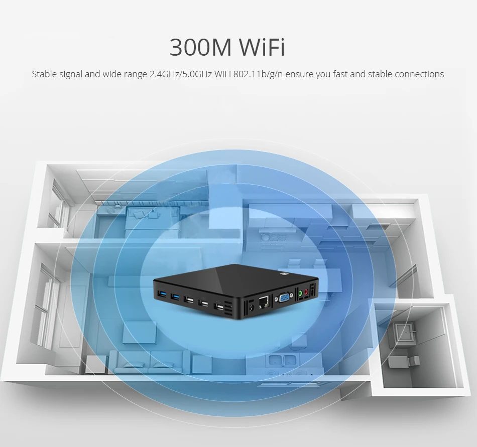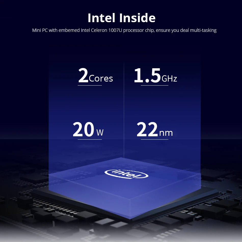 | Mini PC Intel Celeron 1007U 4GB RAM 64GB SSD Windows 10 300Mbps WiFi Gigabit Ethernet HDMI VGA 2*USB3.0 3*USB2.0 |