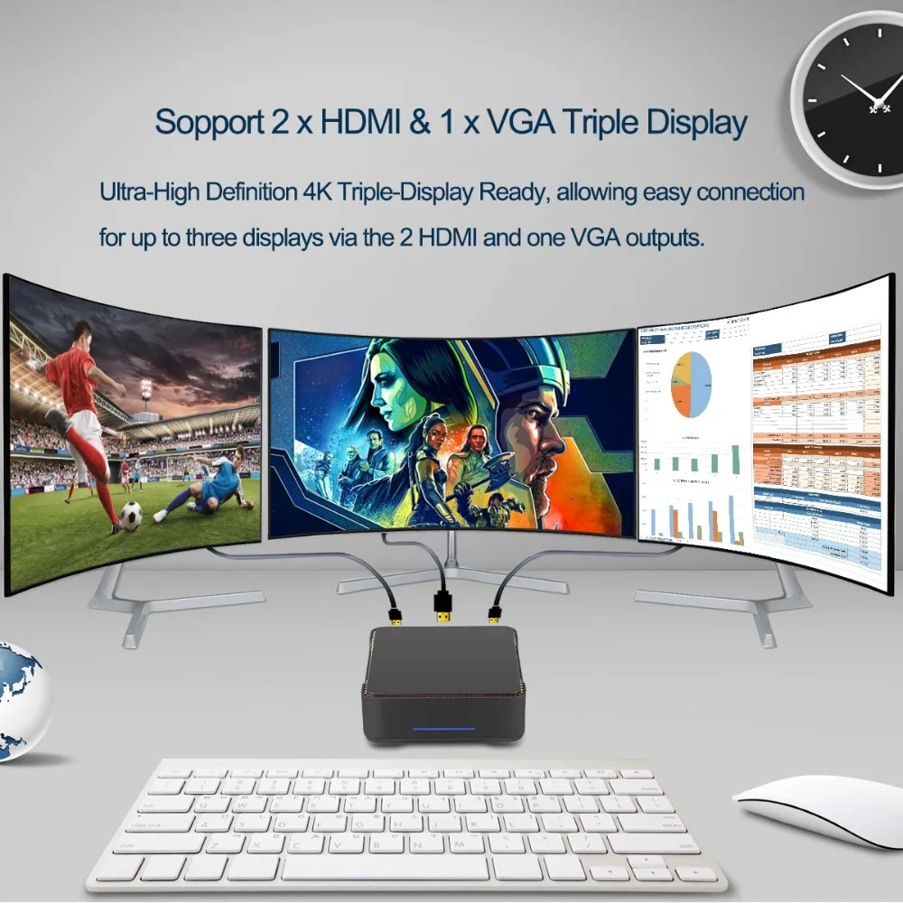 8. support three screen display(two HDMI port and one VGA port)